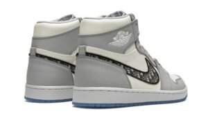 Air Jordans 1 High is arguably the most desirable sneaker collaboration of 2020. Produced in Italy in extremely limited quantities, first ever collaboration with Jordans Brand featured a multilayered release rollout that only stoked demand for one of the most sought after Jordans 1s in recent history. Employing a minimal appearance that parallels the original “White/Grey” Jordans 1 from 1985, variation features supple grey leather overlays on the forefoot, eyelets, collar, and heel. White leather dots the mid-panel and perforated toe. An embroidered monogram Swoosh appears on either side and an “Air” Wings logo can be found on the collar. A white rubber midsole and icy blue translucent outsole tie together the look of the understated? Air Jordans 1.Air Jordans 1 High was released on June 25, 2020.
